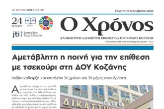 13 Απριλίου Τελευταία ενημέρωση: 2 Οκτωβρίου 2023 15:02 από Χρόνος Κοζάνης Share SHARE Μοιραστείτε την είδηση Facebook Twitter Αντιγραφή συνδέσμου Εκτύπωση ΡΟΗ ΕΙΔΗΣΕΩΝ Πρωτοσέλιδο Πέμπτης 16 Οκτωβρίου 2025 Δράση ενημέρωσης για την «Παγκόσμια Ημέρα Λευκού Μπαστουνιού» στην Κοζάνη Σεμινάριο για την παράνομη διακίνηση αλκοολούχων ποτών από την αστυνομία στην Κοζάνη Εκδήλωση για μυοσκελετική ενδυνάμωση και διατροφή στο Α΄ ΚΑΠΗ Κοζάνης Μουσικοθεατρικό σεμινάριο από το θέατρο “Παρέα” Κουκουλόπουλος: Κανένα «Σπίτι του παιδιού» στη Δυτική Μακεδονία Κ. Βέττα: «Τα αιτήματα των κατοίκων της Αιανής είναι εύλογα, δίκαια και πρέπει να ικανοποιηθούν» H παράταξη “Ενιαίο Ψηφοδέλτιο” για τις εκλογές της ΕΜΔΥΔΑΣ Ψήφισμα του Περιφερειακού Συμβουλίου Δυτικής Μακεδονίας για το Θάνατο της μητέρας του Περιφερειάρχη Δυτικής Μακεδονίας Επίθεση στη ΔΟΥ Κοζάνης: «Είχα μίσος, μόνο μίσος – Δεν μετάνιωσα»