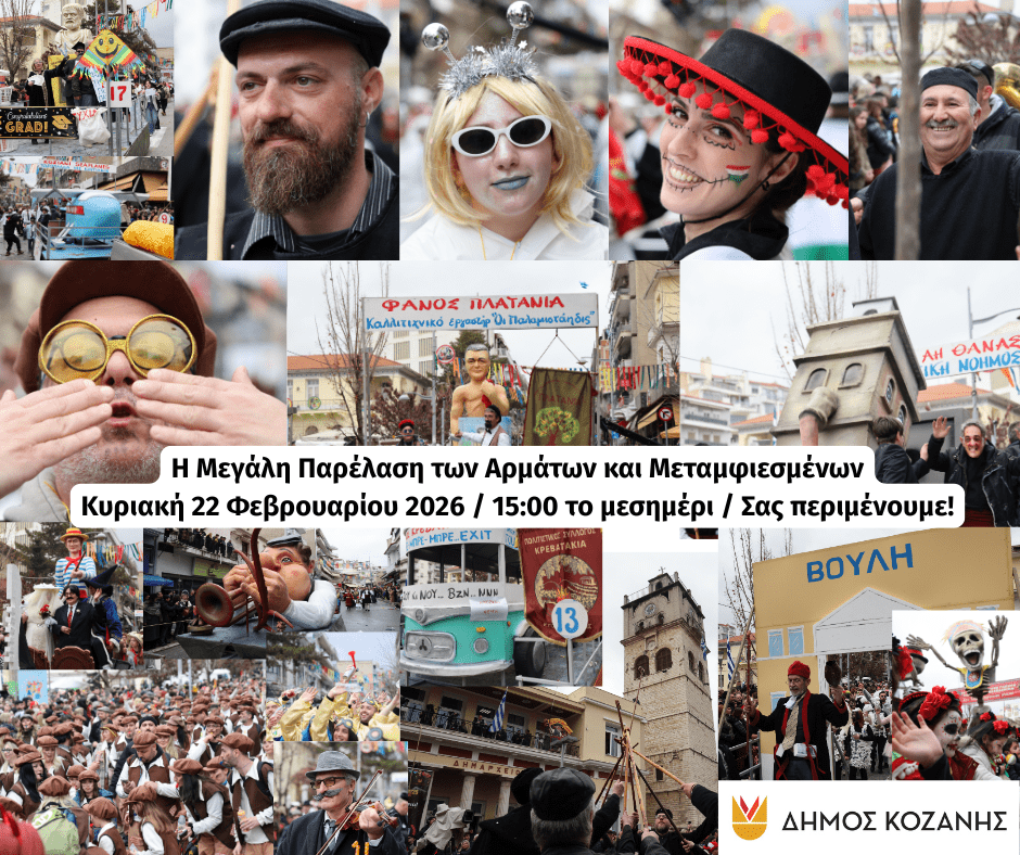Την Κυριακή 22 Φεβρουαρίου 2026 στις 15:00 θα πραγματοποιηθεί η μεγάλη παρέλαση αρμάτων και μεταμφιεσμένων στην κεντρική οδό Παύλου Μελά στην Κοζάνη, όπου τα χρώματα, οι μουσικές, η σάτιρα και η παράδοση σμίγουν αρμονικά, προσφέροντας ξεχωριστές αποκριάτικες στιγμές, σε δημότες και επισκέπτες, με τη συμμετοχή 21 γκρουπ και πλήθους αρμάτων και πεζοπόρων τμημάτων.
