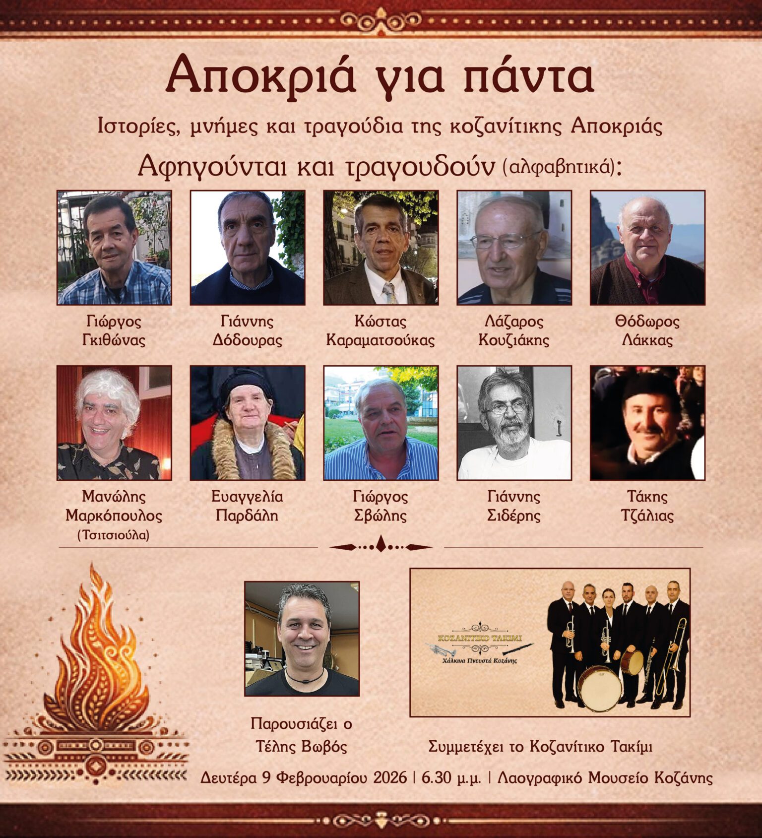 Μία απολαυστική εκδήλωση με ιστορίες, μνήμες και τραγούδια της κοζανίτικης Αποκριάς θα λάβει χώρα τη Δευτέρα 9 Φεβρουαρίου 2026, ώρα 6.30 μ.μ., στο Λαογραφικό Μουσείο Κοζάνης.