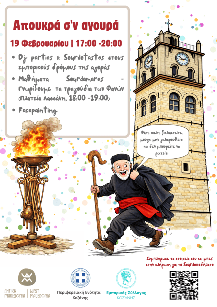 Την 19η Φεβρουαρίου 2026, από τις 17:00 έως τις 20:00, οι εμπορικοί δρόμοι της Κοζάνης γεμίζουν μουσική, χρώμα και αποκριάτικη διάθεση μέσα από τη δράση «Απουκρά σ’ν Αγουρά», που φέρνει την Κοζανίτικη Αποκριά στο κέντρο της αγοράς και συνδέει την παράδοση με τη σύγχρονη εμπορική δραστηριότητα της πόλης.