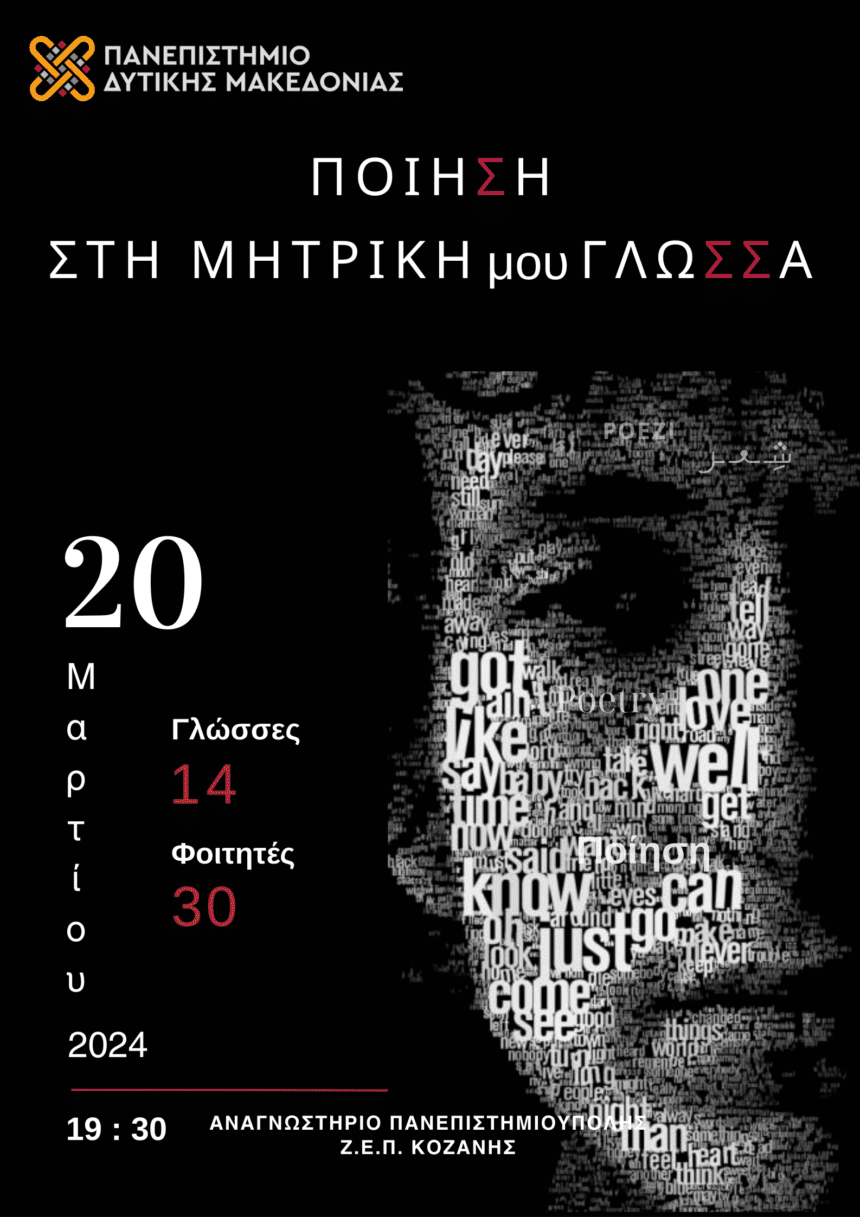 Την Τετάρτη 20 Μαρτίου στις 7.30 μ.μ. στο Αναγνωστήριο της Βιβλιοθήκης του Πανεπιστημίου Δυτικής Μακεδονίας, στην Πανεπιστημιούπολη ΖΕΠ, η φοιτητική Ομάδα ανάγνωσης ποίησης στη μητρική μου γλώσσα. με αφορμή την…