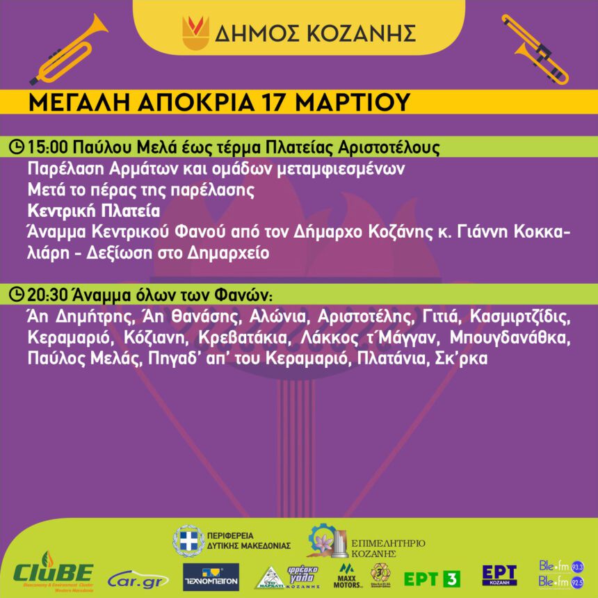 ΜΕΓΑΛΗ ΑΠΟΚΡΙΑ 17 Μαρτίου 15:00 Παύλου Μελά έως τέρμα Πλατείας Αριστοτέλους Παρέλαση Αρμάτων και ομάδων μεταμφιεσμένων Μετά το πέρας της παρέλασης Κεντρική Πλατεία Άναμμα Κεντρικού Φανού από τον Δήμαρχο Κοζάνης…