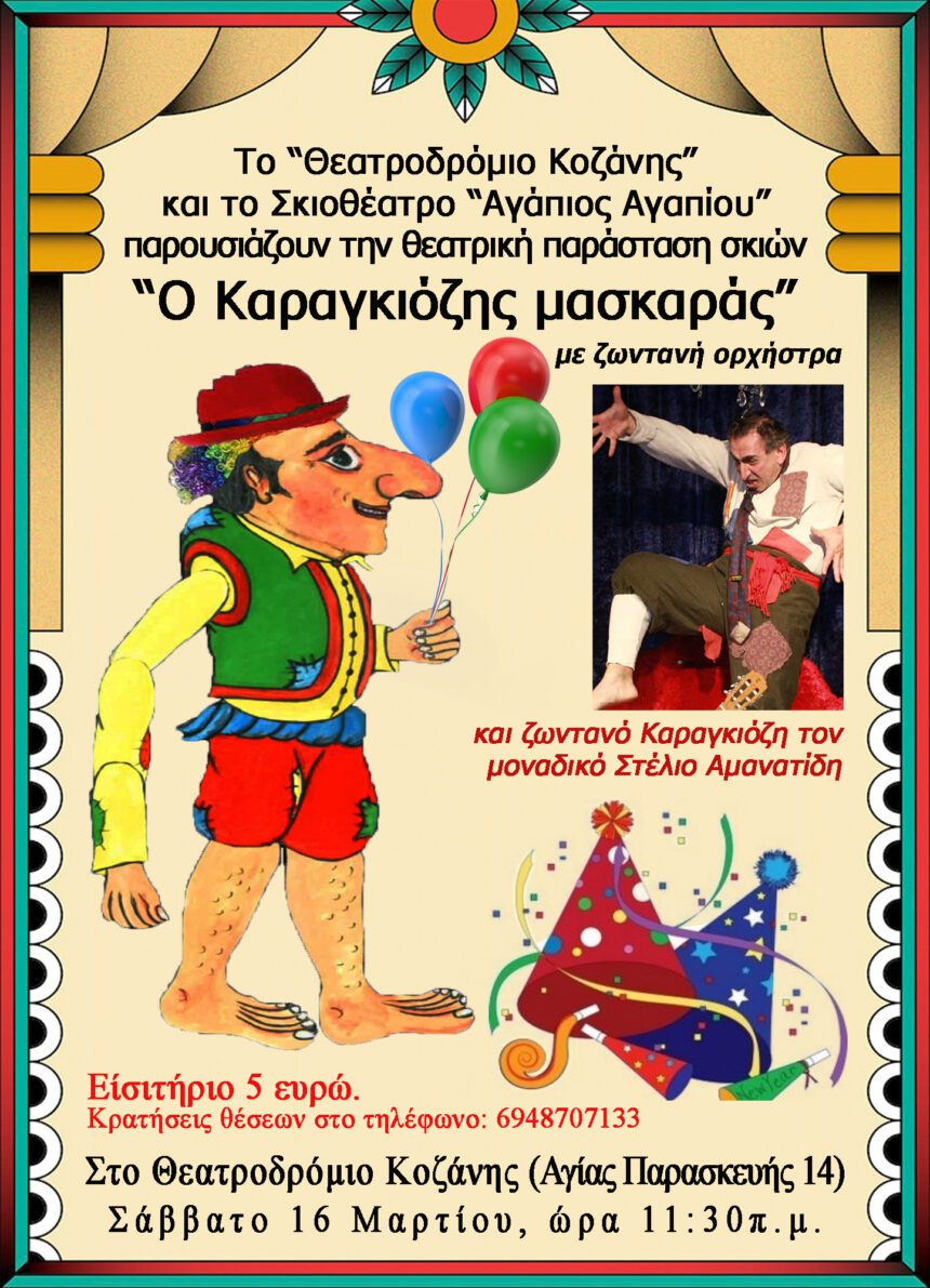 Έρχεται για μια παράσταση το Σάββατο στις 11:30π.μ. Το Θεατροδρόμιο Κοζάνης σε συνεργασία με το Σκιοθέατρο του εξαιρετικού καραγκιοζοπαίχτη Αγάπιο Αγαπίου παρουσιάζει την παράσταση «Ο Καραγκιόζης…Μασκαράς». Μια επίκαιρη κωμωδία με…