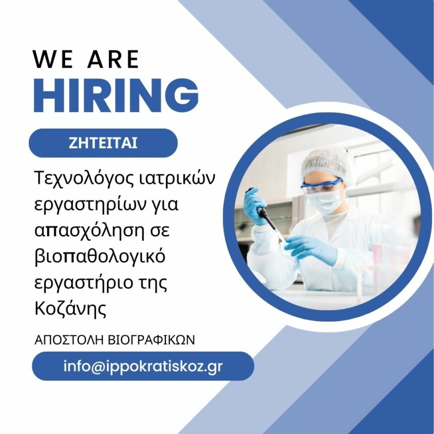 Ζητείται Τεχνολόγος Ιατρικών Εργαστηρίων για απασχόληση σε βιοπαθολογικό εργαστήριο της Κοζάνης. Αποστολή βιογραφικών μόνο με email στο [email protected]