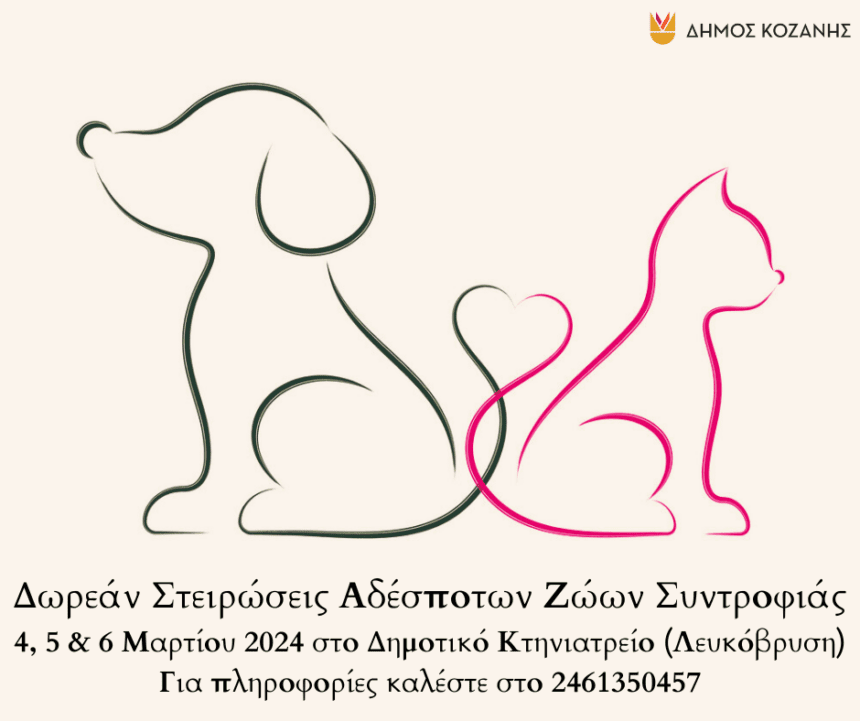 Μία ακόμη δράση με δωρεάν στειρώσεις αδέσποτων σκύλων και γατών από εθελοντές κτηνιάτρους υλοποιεί ο Δήμος Κοζάνης, στοχεύοντας στην ενίσχυση του ολοκληρωμένου προγράμματος διαχείρισης αδέσποτων ζώων συντροφιάς, που ήδη εκπονεί.…