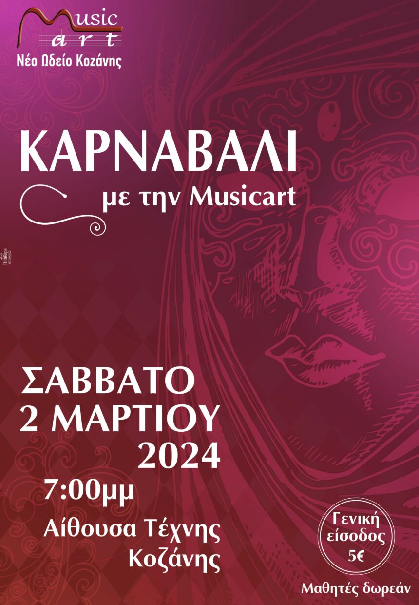 Ενόψει των Απόκρεων που πλησιάζουν σε λίγο καιρό η Musicart-Νέο Ωδείο Κοζάνης σας προσκαλεί στην συναυλία της με θέμα “ Καρναβάλι…. με τη Musicart “ το Σάββατο 2 Μαρτίου 2024…