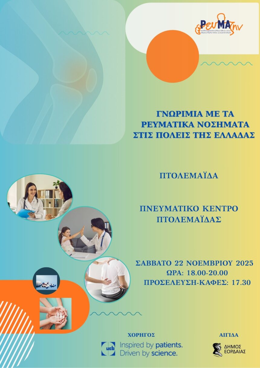 Η Πανελλήνια Ομοσπονδία Ρευμαζήν Συλλόγων ασθενών, γονέων, κηδεμόνων και φίλων παιδιών με ρευματικά νοσήματα «Ρευμαζήν» πραγματοποιεί εκδήλωση με τίτλο «Γνωριμία με τα Ρευματικά Νοσήματα, σε πόλεις της Ελλάδας», στην Πτολεμαΐδα,…