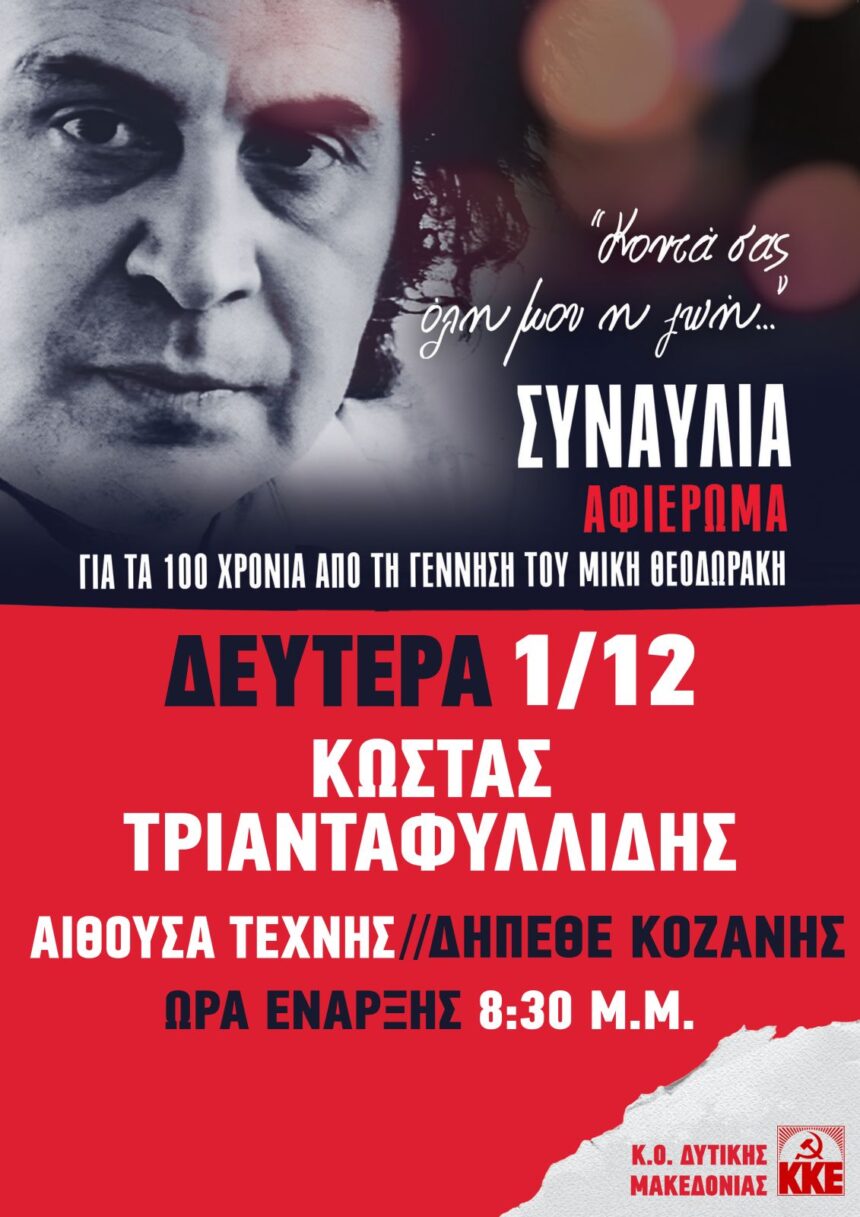 Με τον Κώστα Τριανταφυλλίδη, Δευτέρα 1 Δεκεμβρίου στην Κοζάνη Η Κομματική Οργάνωση Δυτικής Μακεδονίας του ΚΚΕ διοργανώνει μεγάλη συναυλία τη Δευτέρα 1 Δεκεμβρίου, στις 8.30 μ.μ. στην Αίθουσα Τέχνης του ΔΗΠΕΘΕ…