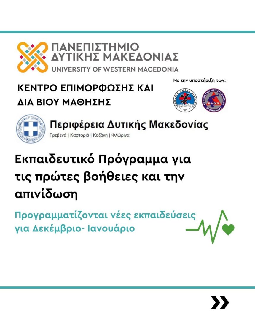 Το Κέντρο Επιμόρφωσης και Διά Βίου Μάθησης (ΚΕΔΙΒΙΜ) του Πανεπιστημίου Δυτικής Μακεδονίας, σε συνεργασία με την Περιφέρεια Δυτικής Μακεδονίας, συνεχίζει δυναμικά την υλοποίηση του Δωρεάν Εκπαιδευτικού Προγράμματος Πρώτων Βοηθειών και…