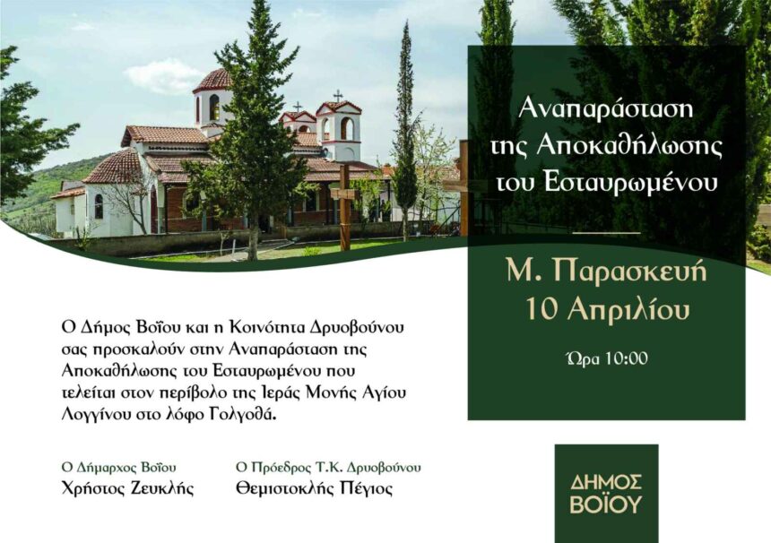 Μ. Παρασκευή 10 Απριλίου Ώρα: 10:00 Ο Δήμος Βοΐου και η Κοινότητα Δρυοβούνου σας προσκαλούν στην Αναπαράσταση της Αποκαθήλωσης του Εσταυρωμένου, που τελείται στον περίβολο της Ιεράς Μονής Αγίου Λογγίνου,…