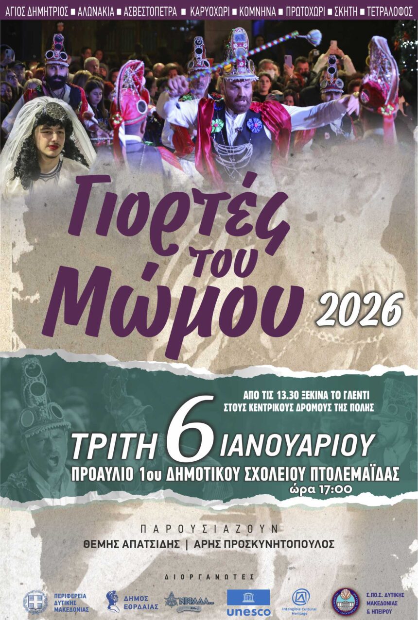 «Γιορτές του Μώμου 2026» Οι Μωμόγεροι στην Πτολεμαΐδα την Τρίτη 6 Ιανουαρίου 2026 και ώρα 5μμ στο 1ο Δημοτικό Σχολείο Η εκδήλωση υλοποιείται μέσα από μια ουσιαστική σύμπραξη φορέων και…