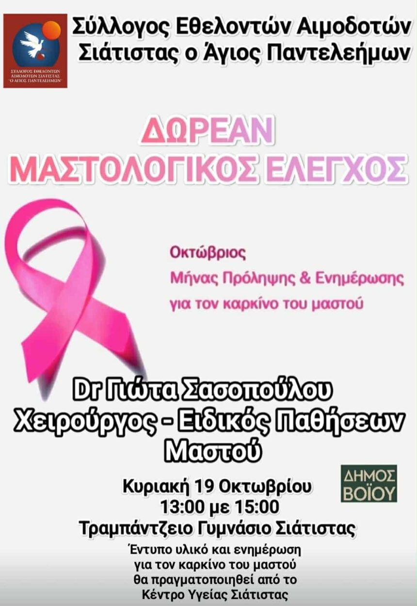 Aπό τον Σύλλογο Εθελοντών Αιμοδοτών Σιάτιστας «Ο Άγιος Παντελεήμων» Κυριακή 19 Οκτωβρίου Ώρες: 13:00 – 15:00 Τραμπάντζειο Γυμνάσιο Σιάτιστας Εξέταση από τη Dr. Γιώτα Σασοπούλου Χειρουργό – Ειδικό Παθήσεων Μαστού…
