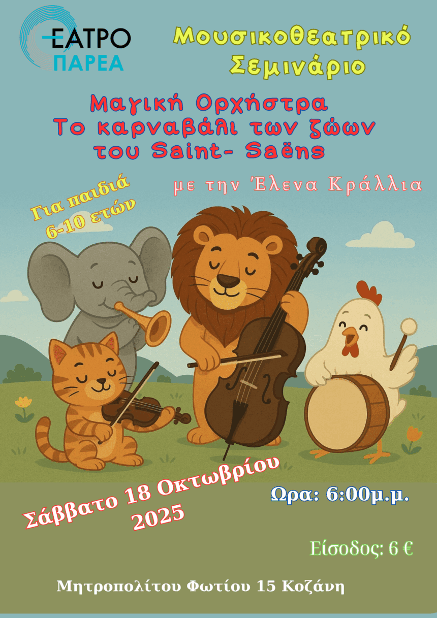Το Θέατρο ΠΑΡΕΑ συνεχίζει τις φθινοπωρινές του δράσεις με το μουσικοθεατρικό σεμινάριο «Μαγική Ορχήστρα/ Το καρναβάλι των ζώων » το Σάββατο 18 Οκτωβρίου στις 6:00 μ.μ. Το σεμινάριο απευθύνεται σε…