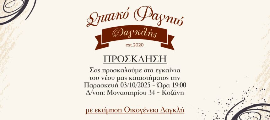 Τα εγκαίνια του νέου καταστήματός της πραγματοποιεί την Παρασκευή 3 Οκτωβρίου 2025, στις 19:00, η επιχείρηση «Σπιτικό Φαγητό Δαγκλής». Η εκδήλωση θα γίνει στο νέο χώρο της, στην οδό Μοναστηρίου…