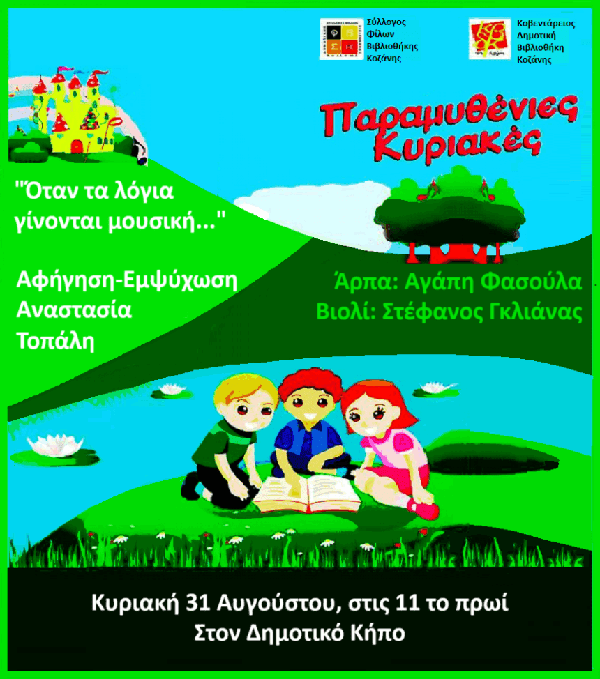 «Όταν τα λόγια γίνονται μουσική…» Αφήγηση – Εμψύχωση Αναστασία Τοπάλη Άρπα: Αγάπη Φασούλα Βιολί: Στέφανος Γκλιάνας Κυριακή 31 Αυγούστου, στις 11 το πρωί Στον Δημοτικό Κήπο. Πάρτε τα παιδιά σας…