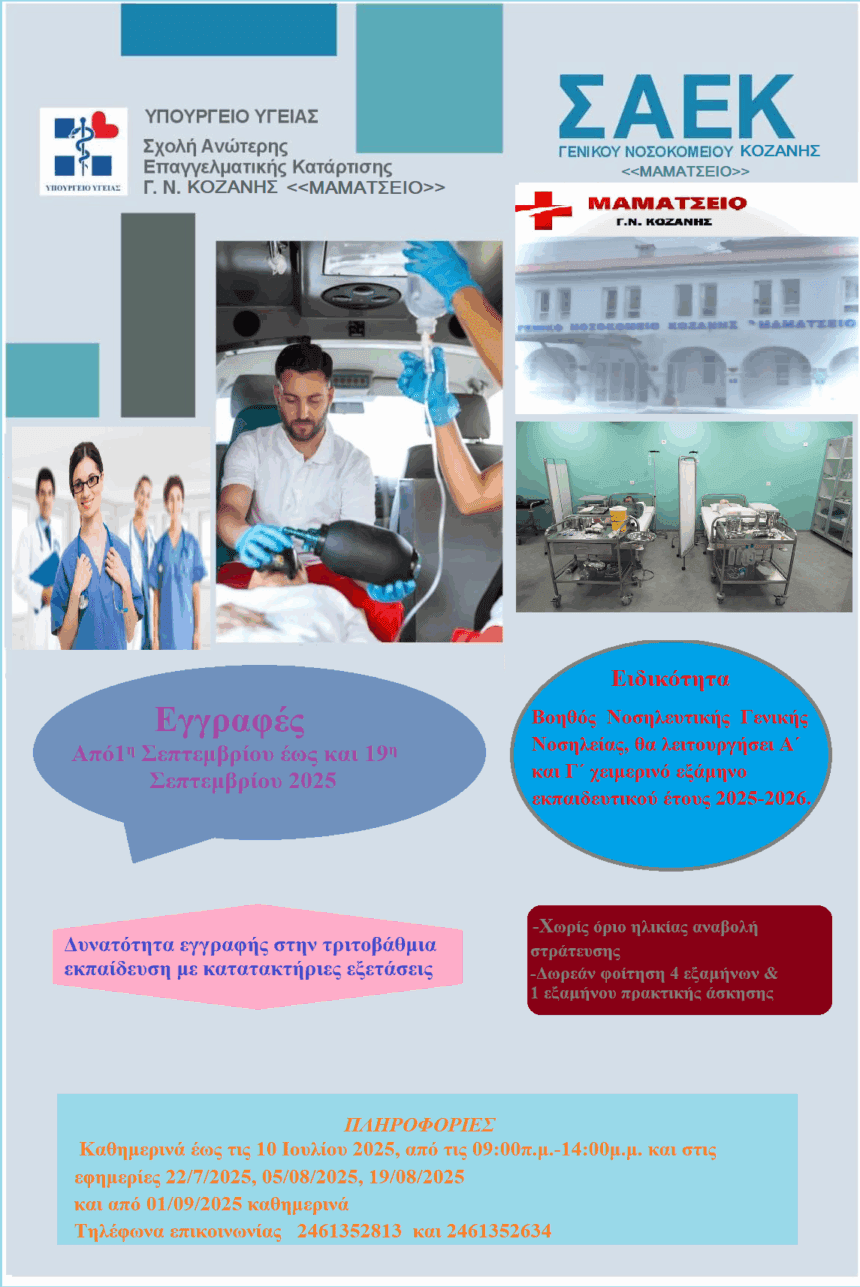Στην Σχολή Ανώτερης Επαγγελματικής Κατάρτισης (Σ.Α.Ε.Κ.) με ειδικότητα «Βοηθός Νοσηλευτικής Γενικής Νοσηλείας» του Γενικού Νοσοκομείου Κοζάνης «Μαμάτσειο», θα λειτουργήσει Α΄ και Γ΄ χειμερινό εξάμηνο εκπαιδευτικού έτους 2025-2026. ΔΥΝΑΤΟΤΗΤΑ ΕΓΓΡΑΦΗΣ ΕΧΟΥΝ:…