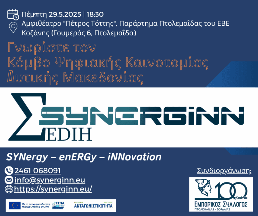 Ο Κόμβος Ψηφιακής Καινοτομίας Δυτικής Μακεδονίας SYNERGiNN EDIH διοργανώνει εκδήλωση γνωριμίας με τις επιχειρήσεις και τους δημόσιους οργανισμούς της Πτολεμαϊδας, στο Αμφιθέατρο "Πέτρος Τόττης" του Παραρτήματος Πτολεμαΐδας του ΕΒΕ Κοζάνης…