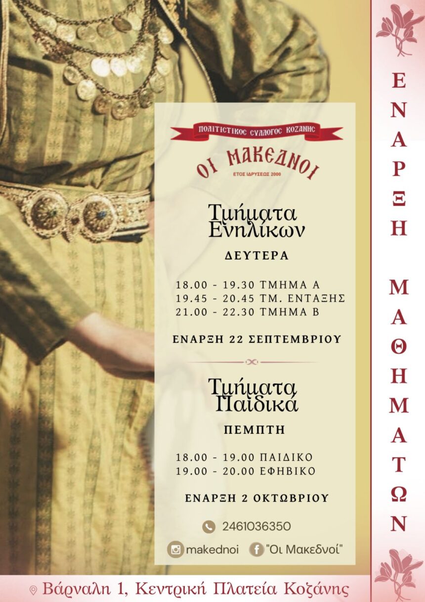 Τη Δευτέρα 22 Σεπτεμβρίου ξεκινούν τα μαθήματα των χορευτικών τμημάτων ενηλίκων του Πολιτιστικού Συλλόγου Κοζάνης «Οι Μακεδνοί», ενώ την Πέμπτη 02 Οκτωβρίου τα παιδικά τμήματα. Τα μαθήματα των ενηλίκων κάθε…