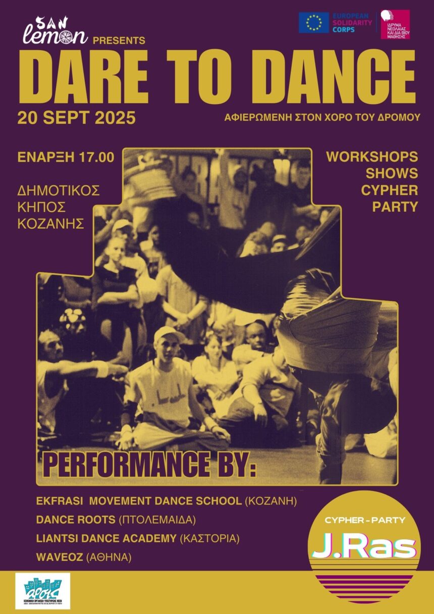 Οι SAN TEAM της ΑΡΣΙΣ Κοζάνης και οι LEMON SKATES σας προσκαλούν το Σάββατο 20 Σεπτέμβριου, από τις 17:00, στο Δημοτικό Κήπο Κοζάνης, σε μία εκρηκτική βραδιά, αφιερωμένη στο χορό…