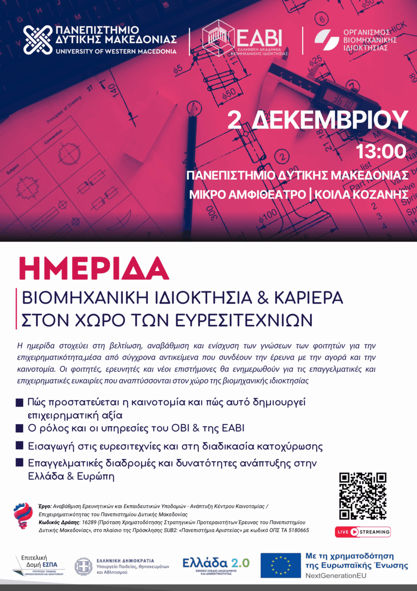 Την Τρίτη 2 Δεκεμβρίου 2025, στις 13:00, στο Μικρό Αμφιθέατρο της Πανεπιστημιούπολης στα Κοίλα Κοζάνης, το Πανεπιστήμιο Δυτικής Μακεδονίας διοργανώνει ημερίδα με θέμα:«Βιομηχανική Ιδιοκτησία & Καριέρα στον Χώρο των Ευρεσιτεχνιών»,σε…