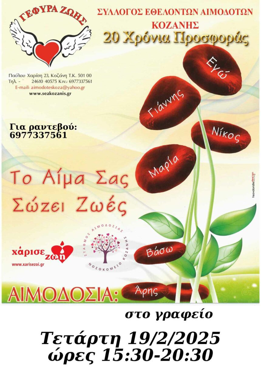 Την Τετάρτη 19 Φεβρουαρίου 2025 από τις 15:30 – 20:00, (προσέλευση μέχρι 19:30), στο γραφείο του Συλλόγου, Π. Χαρίση 23 θα πραγματοποιηθεί εθελοντική αιμοδοσία με την Αιμοδοσία του «Μαμάτσειου» Γ.Ν.…