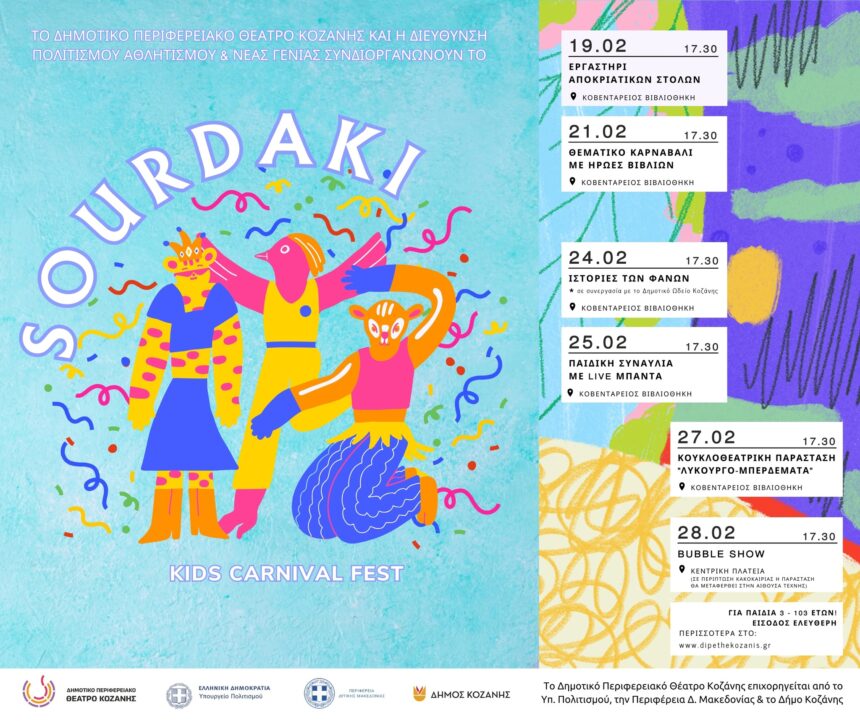 Το Δημοτικό Περιφερειακό Θέατρο Κοζάνης και η Διεύθυνση Πολιτισμού, Αθλητισμού & Νέας Γενιάς Δήμου Κοζάνης, συνδιοργανώνουν για πρώτη φορά το SOURDAKI, ένα καρναβαλικό Φεστιβάλ με πολυποίκιλες δράσεις και παραστάσεις, για…
