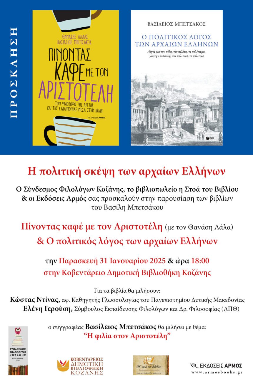Ο Σύνδεσμος Φιλολόγων Κοζάνης, το βιβλιοπωλείο η Στοά του Βιβλίου & οι Εκδόσεις Αρμός σας προσκαλούν στην παρουσίαση των βιβλίων του Βασίλη Μπετσάκου Πίνοντας καφέ με τον Αριστοτέλη (με τον Θανάση Λάλα) &…