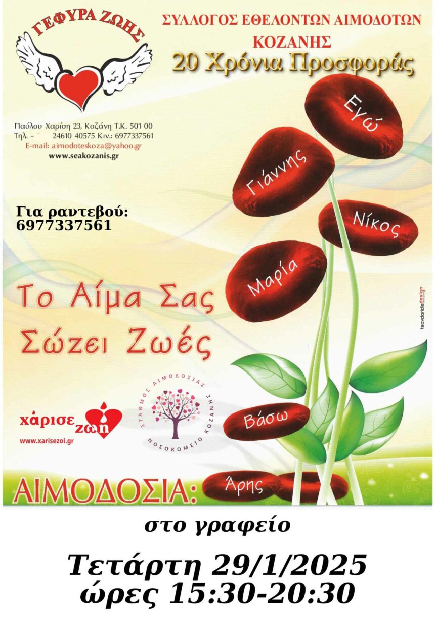 Την Τετάρτη 29 Ιανουαρίου 2025 από τις 15:30 – 20:00, (προσέλευση μέχρι 19:30), πραγματοποιείται αιμοδοσία στα γραφεία του Συλλόγου, Π. Χαρίση 23 με το τμήμα Αιμοδοσίας του «Μαμάτσειου» Γ.Ν. Κοζάνης…