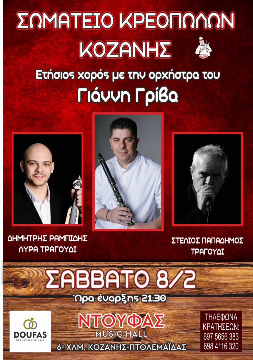 Τον ετήσιο χορό του με την ορχήστρα του Γιάννη Γρίβα θα πραγματοποιήσει το Σωματείο Κρεοπωλών Κοζάνης, το Σάββατο 8 Φεβρουαρίου στο Ντούφας Music Ηall, στο 6ο χλμ. Κοζάνης - Πτολεμαΐδας.