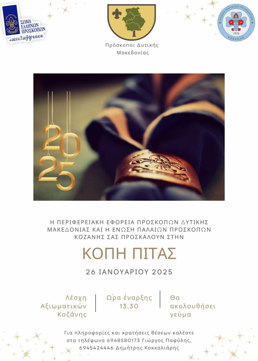 Η Περιφερειακή Εφορεία Προσκόπων Δυτικής Μακεδονίας και η Ένωση Παλαιών Προσκόπων Κοζάνης, σας προσκαλούν στην καθιερωμένη κοπή της πίτας για το νέο έτος, την Κυριακή 26 Ιανουαρίου και ώρα 13.30…