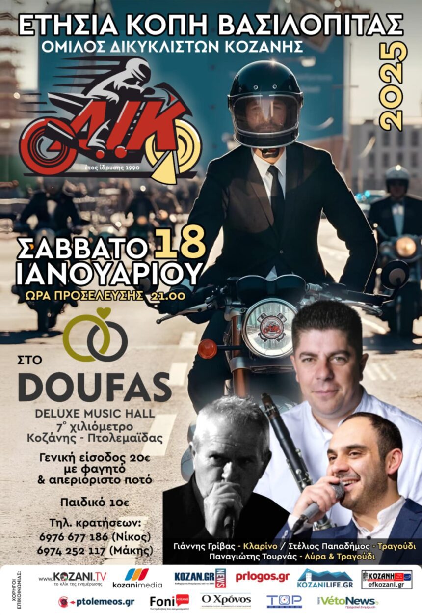 Ο Όμιλος Δικυκλιστών Κοζάνης διοργανώνει το Σάββατο 18 Ιανουαρίου και ώρα 21:00 , την ετήσια κοπή βασιλόπιτας, στο DOUFAS DELUXE MUSIC HALL , με τον Γιάννη Γρίβα στο κλαρίνο, Στέλιο…