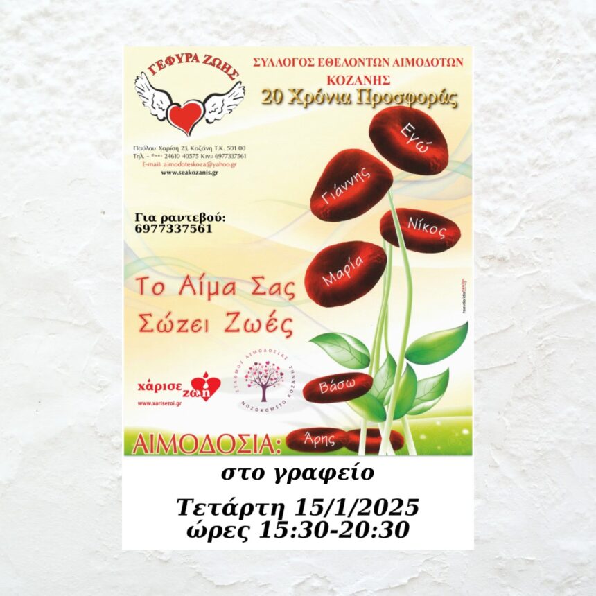 Την Τετάρτη 15 Ιανουαρίου 2025 από τις 15:30 – 20:00, (προσέλευση μέχρι 19:30), στα γραφεία του Συλλόγου, Π. Χαρίση 23 με την Αιμοδοσία του «Μαμάτσειου» Γ.Ν. Κοζάνης θα πραγματοποιηθεί η…
