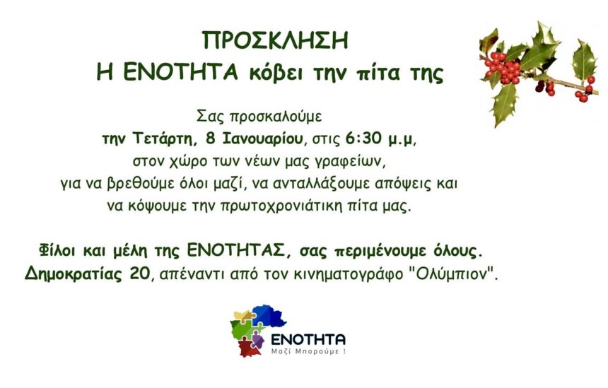 Η "Ενότητα" υποδέχεται τη νέα χρονιά με την κοπή της πρωτοχρονιάτικης πίτας της, η οποία θα πραγματοποιηθεί στα νέα, γραφεία της, επί της οδού Δημοκρατίας 20, την Τετάρτη 8 Ιανουαρίου…