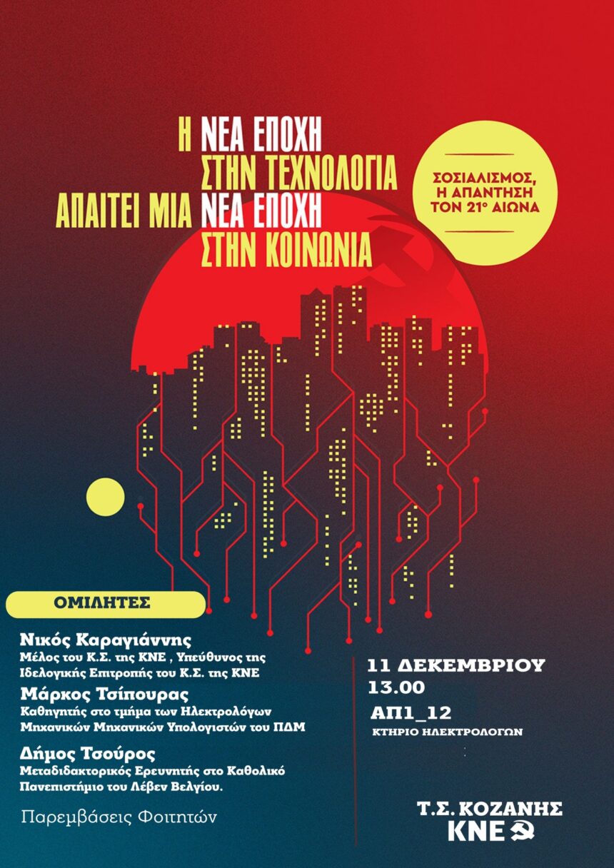 Το Τομεακό Συμβούλιο Κοζάνης της ΚΝΕ διοργανώνει εκδήλωση με αφορμή την παρουσίαση της μπροσούρας της Ιδεολογικής Επιτροπής του Κ.Σ. της ΚΝΕ, με τίτλο: «Η νέα εποχή στην τεχνολογία απαιτεί και…