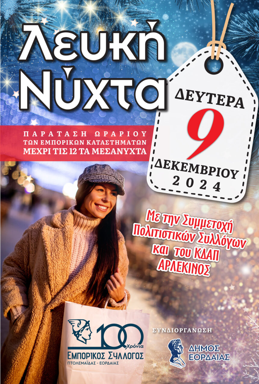 Ο Εμπορικός Σύλλογος Πτολεμαΐδας - Εορδαίας προσκαλεί όλους τους καταναλωτές, τους εργαζόμενους και τους εμπόρους στη διεξαγωγή της Λευκής Νύχτας 2024, η οποία θα πραγματοποιηθεί τη Δευτέρα 9 Δεκεμβρίου και…