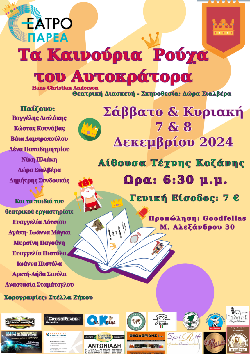Μια θεατρική παράσταση για μικρούς και μεγάλους Η Εταιρεία Καλλιτεχνικής & Παιδευτικής Θεατρικής Έκφρασης «Θέατρο ΠΑΡΕΑ» με έδρα την Κοζάνη, παρουσιάζει τη θεατρική χριστουγεννιάτικη παράσταση με τίτλο: «Τα καινούρια ρούχα…