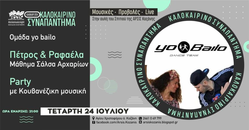 Το πιο καλοκαιρινό και φρέσκο party της πόλης, στο ΚΑΛΟκαιρινό ΣΥΝΑΠΑΝΤΗΜΑ, (εκτάκτως) την Τετάρτη 24 Ιουλίου, στις 21:00, στην αυλή του σπιτιού της ΑΡΣΙΣ Κοζάνης, με καλεσμένη τη χορευτική ομάδα…