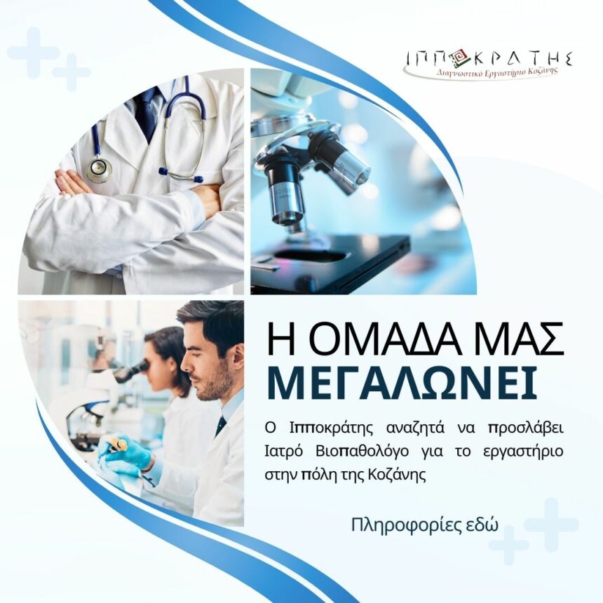 Το Ιδιωτικό Διαγνωστικό Κέντρο «Ιπποκράτης Κοζάνης Α.Ε.» επιθυμεί να προσλάβει Ιατρό Βιοπαθολόγο για το εργαστήριο στην πόλη της Κοζάνης. Προσφέρονται: Αιτήσεις ή πληροφορίες στο email: [email protected] / 6940451485