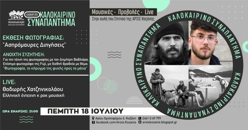 Την Πέμπτη 18 Ιουλίου, στις 21:00, η αυλή του σπιτιού της ΑΡΣΙΣ Κοζάνης γεμίζει με φωτογραφίες, συζητήσεις και μουσικές. Φιλοξενούμε τον Δημήτρη Βαβλιάρα, επίσημο φωτογράφο της Fuji, με διεθνή βραβεία,…