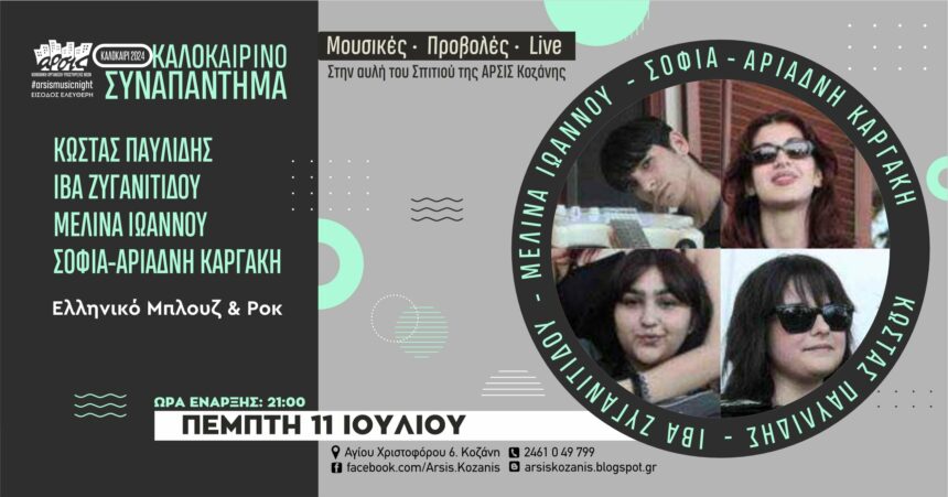Την Πέμπτη, 11 Ιουλίου, στις 21:00 υποδεχόμαστε στην αυλή του σπιτιού της ΑΡΣΙΣ Κοζάνης, τέσσερα ταλαντούχα παιδιά, που δεν διστάζουν να μοιραστούν μαζί μας τις μουσικές τους ανησυχίες. Σε ρυθμούς…