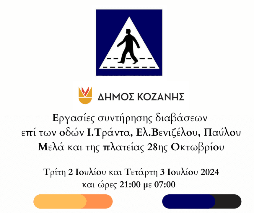 Η Διεύθυνση Τεχνικών Υπηρεσιών του Δήμου Κοζάνης ενημερώνει τους δημότες ότι την Τρίτη 2 Ιουλίου και την Τετάρτη 3 Ιουλίου 2024 και ώρες 21:00 το βράδυ με 07:00 το πρωί,…
