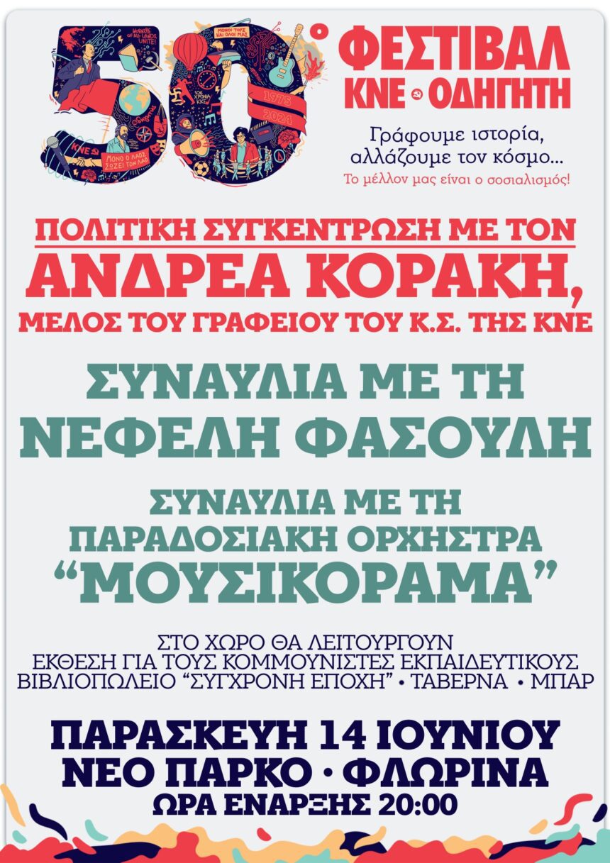 Το 50ο Φεστιβάλ ΚΝΕ-Οδηγητή ξεκινάει το ταξίδι του στην Δυτική Μακεδονία από την πόλη της Φλώρινας την Παρασκευή 14 Ιούνη, στο Νέο Πάρκο Φλώρινας! Το σύνθημα του φεστιβάλ "Γράφουμε ιστορία,…