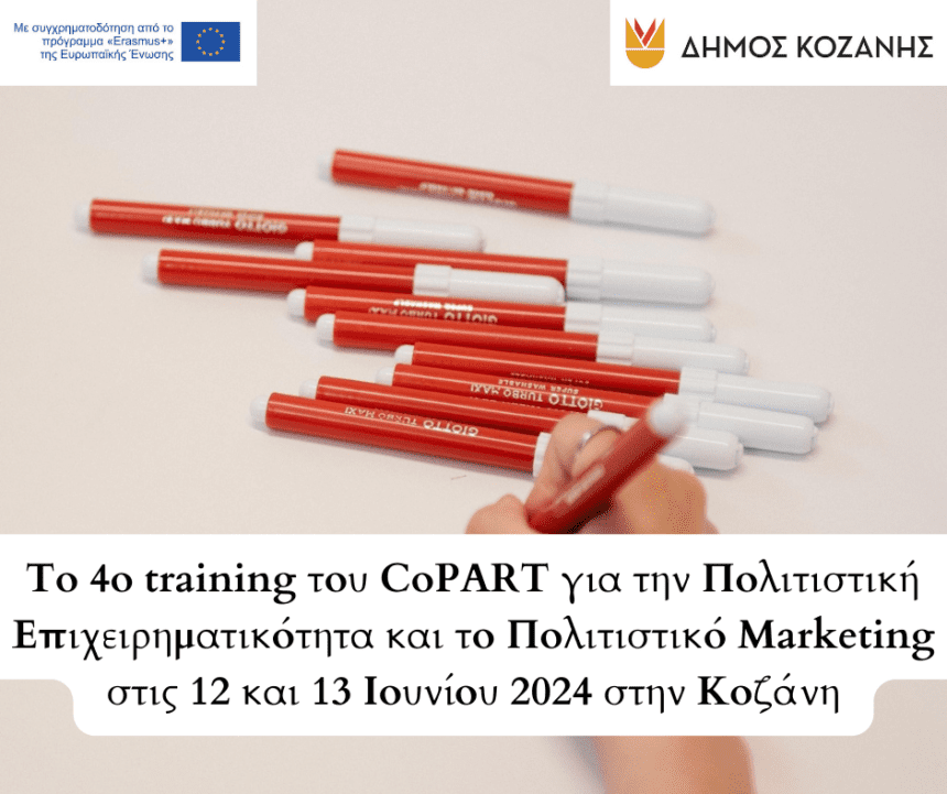 Αν είσαι 18 - 30 ετών, το 4ο training του CoPART (Community Participation in ARts) για την Πολιτιστική Επιχειρηματικότητα και το Πολιτιστικό Marketing, που πραγματοποιείται στο πλαίσιο των trainings για…