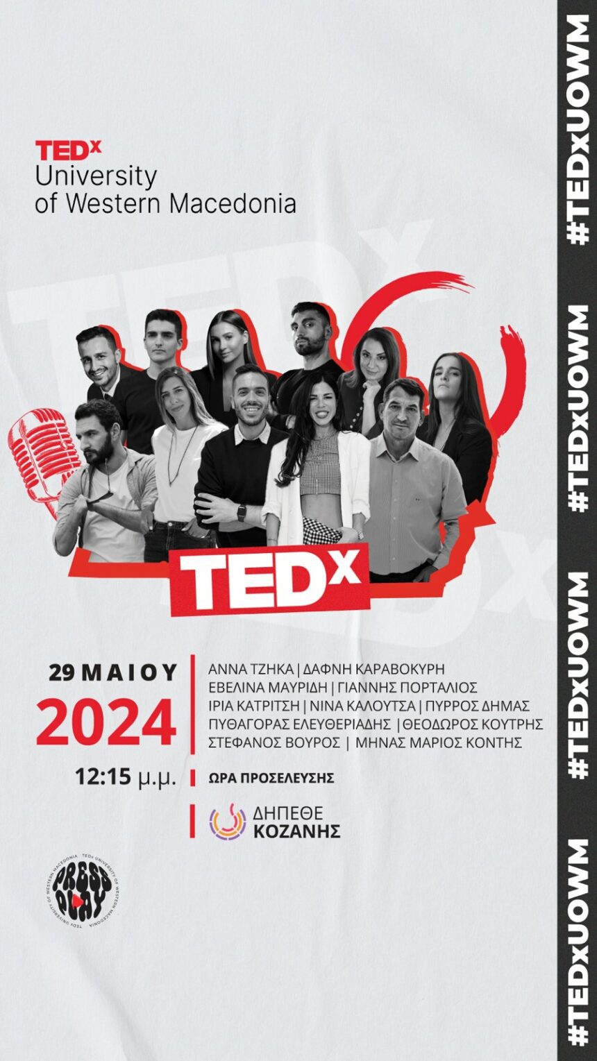 Το TEDxUniversityOfWesternMacedonia ανανεώνει το ραντεβού του για δεύτερη συνεχή χρονιά για τις 29 Μαΐου 2024, στην κεντρική Αίθουσα του ΔΗΠΕΘΕ, στην Κοζάνη με διακριτό τίτλο “Press play”. Στόχος του TEDx…