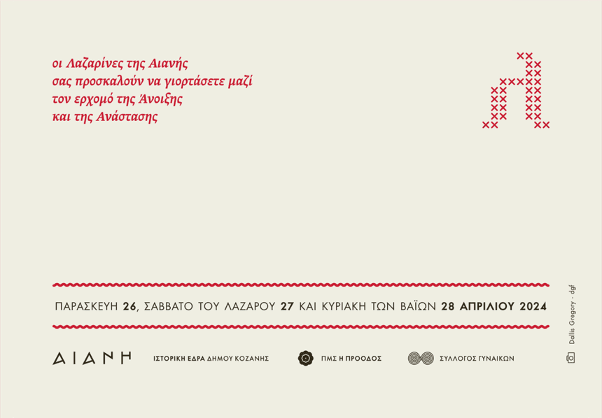 Παρασκευή 26 Απριλίου Αίθουσα Πολιτισμού 7:30 μμ: ‘’Λαζαρίνες Αιανής: Η εξέλιξη του εθίμου στο διάβα του χρόνου‘’ Ομιλητής Στέλιος Μπούκος Καθηγητής Φυσικής Αγωγής ‘’Οι Λαζαρίνες της Αιανής ώς…