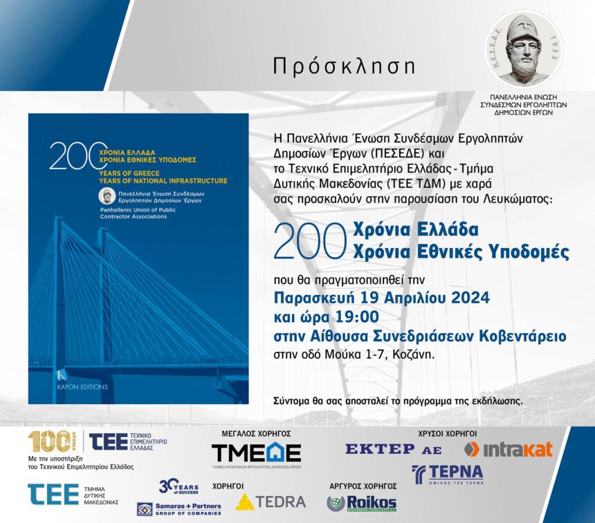 Την Παρασκευή 19 Απριλίου 2024 η Πανελλήνια Ένωση Συνδέσμων Εργοληπτών Δημοσίων Έργων (ΠΕΣΕΔΕ) με το Τεχνικό Επιμελητήριο Ελλάδος – Τμήμα Δυτικής Μακεδονίας (ΤΕΕ ΤΔΚ) διοργανώνουν την ιστορική εκδήλωση – παρουσίαση…