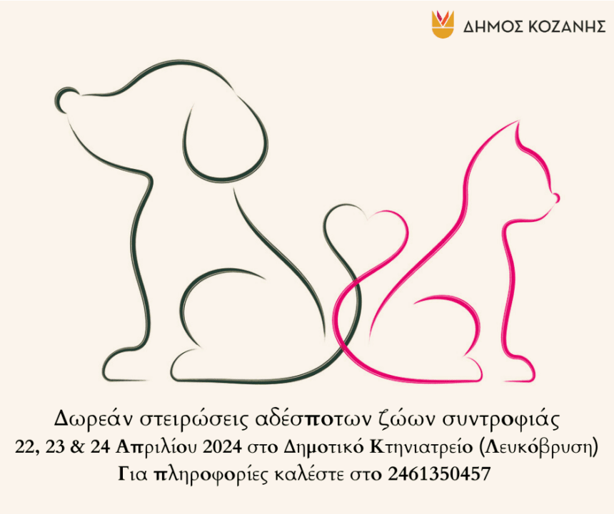 Μία ακόμη δράση με δωρεάν στειρώσεις αδέσποτων σκύλων και γατών από εθελοντές κτηνιάτρους υλοποιεί ο Δήμος Κοζάνης, στοχεύοντας στην ενίσχυση του ολοκληρωμένου προγράμματος διαχείρισης αδέσποτων ζώων συντροφιάς, που ήδη εκπονεί.…