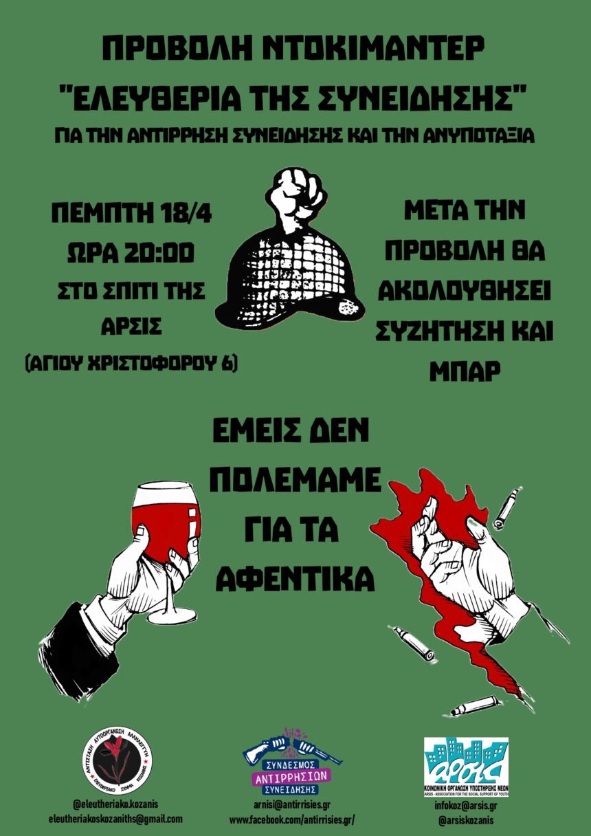 Σας καλούμε την Πέμπτη 18 Απριλίου, στις 20:00, στο σπίτι της ΑΡΣΙΣ Κοζάνης, να παρακολουθήσετε την προβολή του ντοκιμαντέρ «Ελευθερία της Συνείδησης» που διοργανώνουν ο Σύνδεσμος Αντιρρησιών Συνείδησης, το Ελευθεριακό…