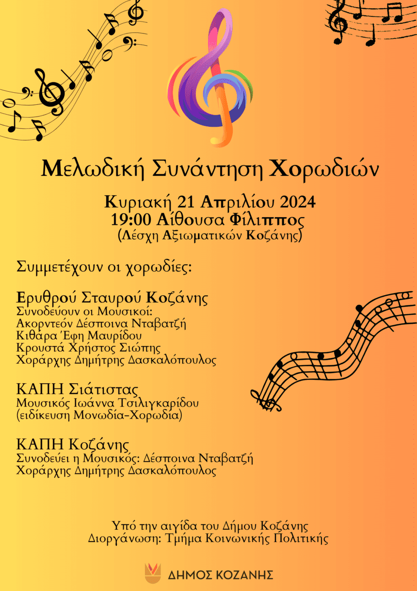 Με τη συμμετοχή των χορωδιών του Ερυθρού Σταυρού Κοζάνης, του ΚΑΠΗ Σιάτιστας και του ΚΑΠΗ Κοζάνης, θα πραγματοποιηθεί αυτή την Κυριακή 21 Απριλίου 2024 και ώρα 19:00 το απόγευμα στην…