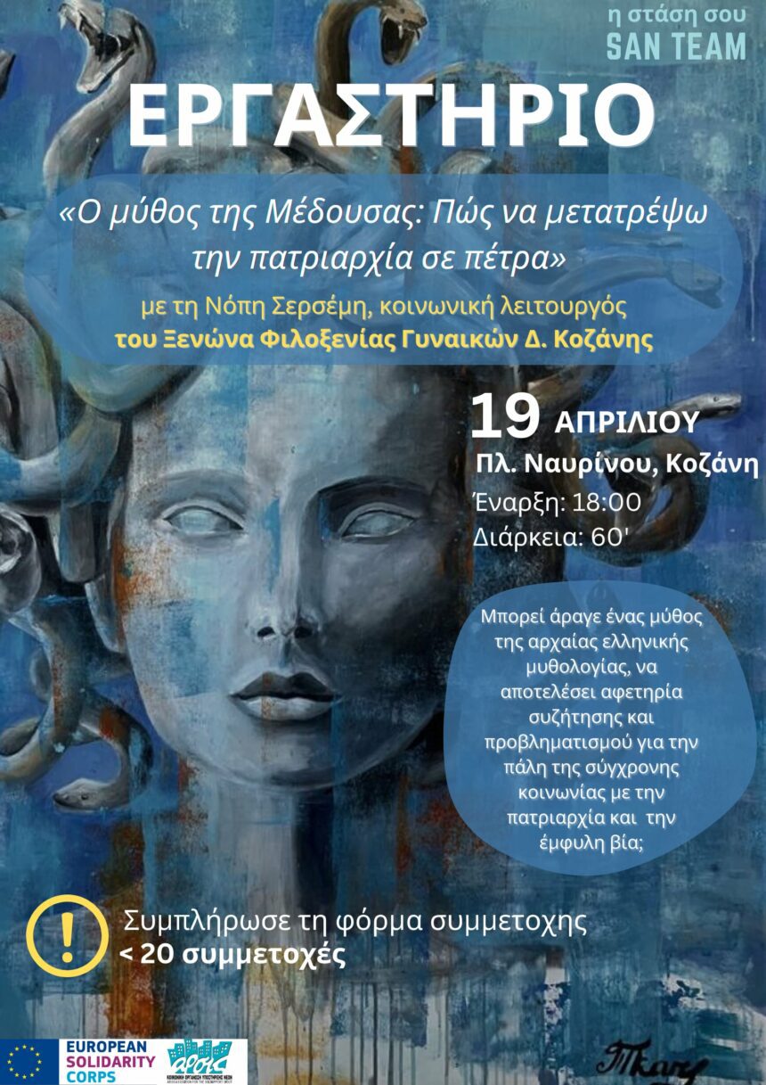 Σας καλούμε την Παρασκευή 19 Απριλίου, στις 18:00, στην Πλατεία Ναβαρίνου στην Κοζάνη, να πάρετε μέρος στο βιωματικό εργαστήριο «Myth of Medusa: Πως να μετατρέψω την πατριαρχία σε πέτρα», που…